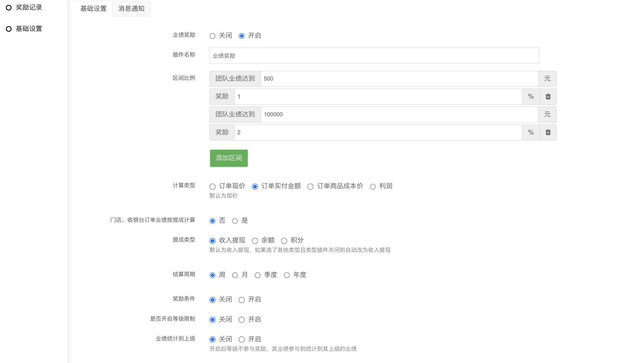 结算周期:选择周则周一奖励,选择月则1号奖励,选择季度则每季度的1号奖励,选择年度则每年的1号奖励。