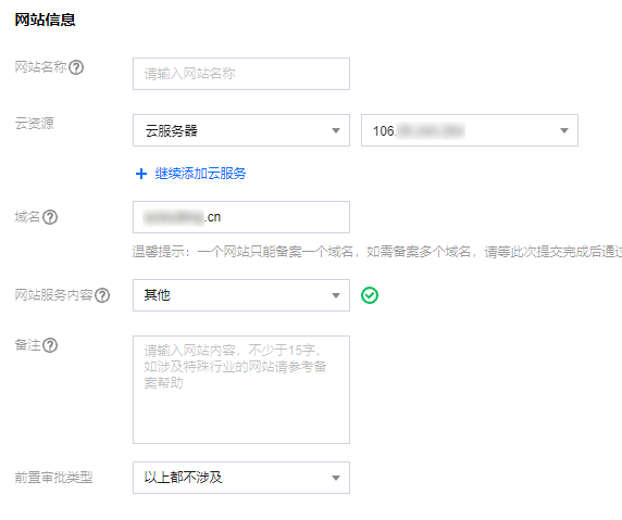 如需备案多个网站,则可单击添加备案网站,添加新的网站信息。